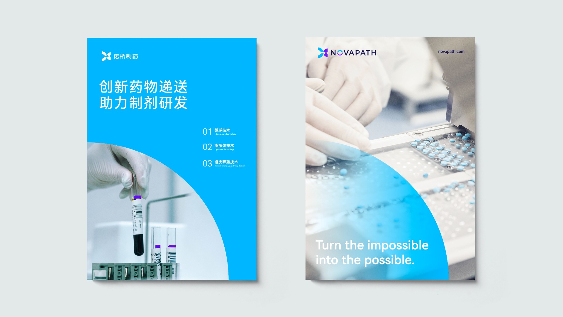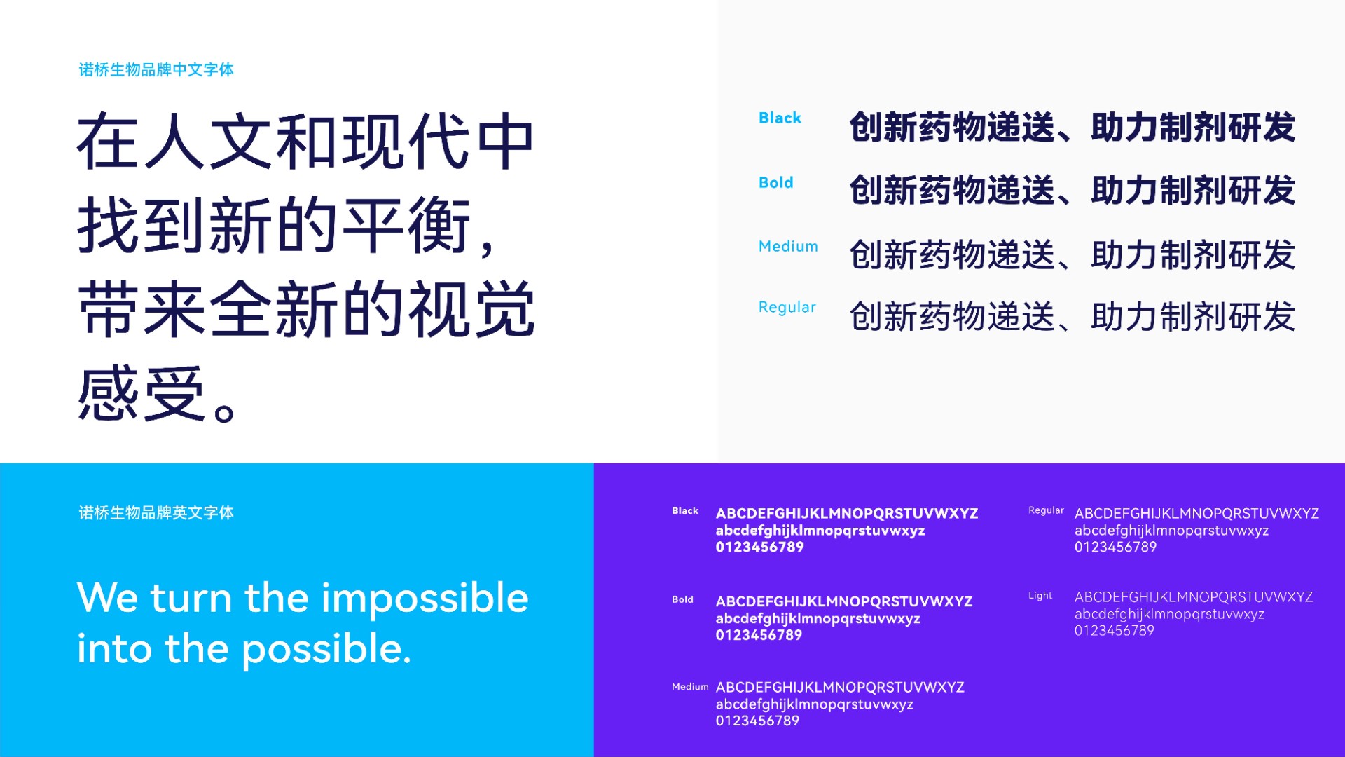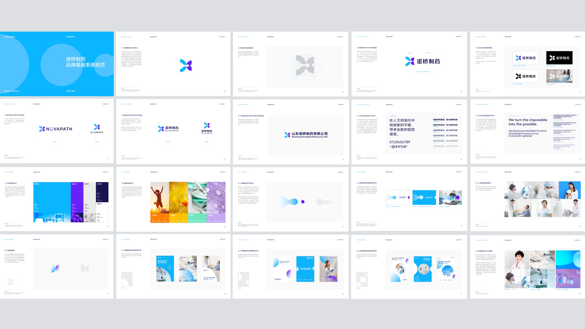 在品牌視覺系統的其他要素建設中,于色彩部分,我們使用了更明亮的藍色凸顯諾橋制藥的創(chuàng)新科研專業(yè)能力。又從諾橋藍中衍生出一個藍紫色,正所謂“青出于藍而勝于藍”,這組品牌主色明快、純粹,演繹了諾橋在不斷追求技術卓越創(chuàng)新中的探索精神。塑造了諾橋的色彩情緒識別,于圖形部分,我們結合了藥物遞送中最有價值的現象,通過對藥物的高效靶向遞送解決藥物研發(fā)及病癥難關的“最后一公里”,通過平面手法呼應藥物分子生物輪廓的圓形,延續(xù)圖形標志中的從左至右的穿透狀態(tài),將從虛到實、從散到聚的狀態(tài)發(fā)揮至諾橋品牌的主輔助圖形中,形成獨具個性的諾橋制藥圖形語言,有效反應了諾橋制藥的核心技術價值,在整體元素的有機結合之下,諾橋制藥通過視覺形象揉捏了技術價值與文化價值,將技術表達理念的想象帶到品牌識別中,形成一個獨特且具備專業(yè)質感的品牌印象,有效的幫助了諾橋制藥快速傳達的需求,更好的幫助該品牌在市場中形成聲量,提升商業(yè)價值。