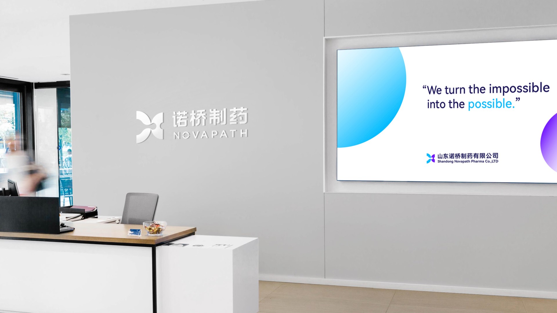 我們在這關鍵性描述的指導下,為諾橋制藥提出了全新的品牌視覺概念語言:“成功新通道”。根據這一概念,我們開發(fā)了諾橋制藥品牌的視覺形象。其中,諾橋的圖形標志靈感來自于諾橋團隊分享的科研資料中“脂質體技術”在靶向給藥過程中的藥物分子遞送狀態(tài),我們進一步對此抽象概念語言進行了可視化的具像呈現。用左右兩邊半圓之中的液體流動輪廓表現了在藥物遞送過程中有方向性的、具有穿透感的藥物遞送瞬間。同時此圖形標志整體也構成了字母“N”的形狀,賦予諾橋制藥(NOVAPATH)更多的品牌專屬性和識別性。